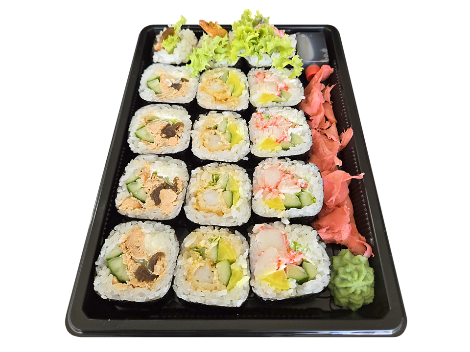 - ryż, krewetka w temp. i panko, rzepa, ogórek, sałata, chili majo, nori,