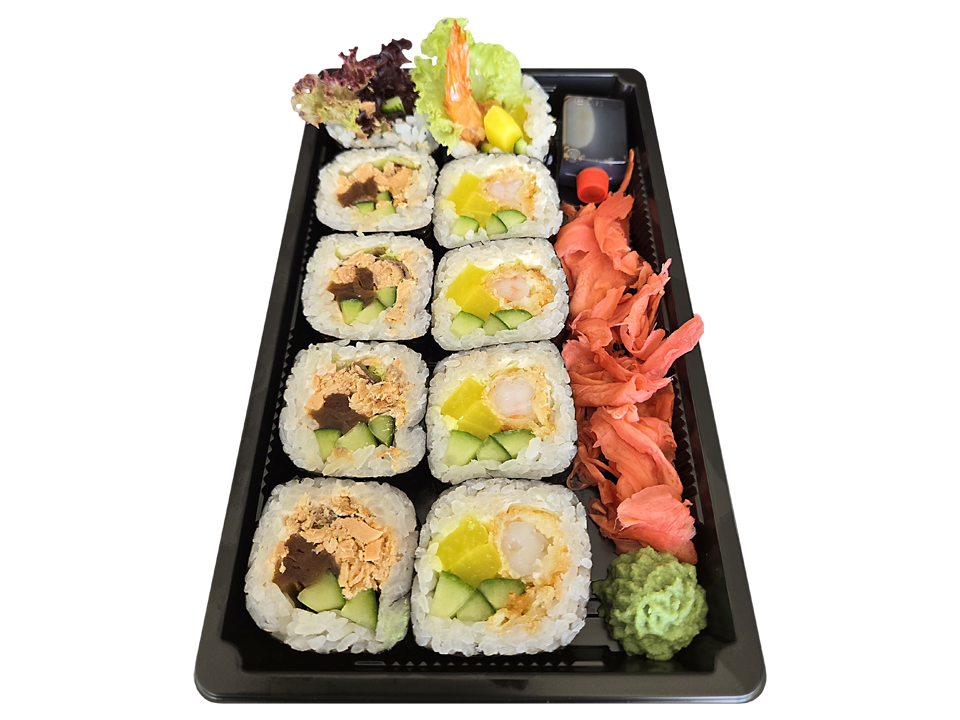 - ryż, krewetka w tempurze i panko, rzepa, ogórek, sałata, chili majo, nori,