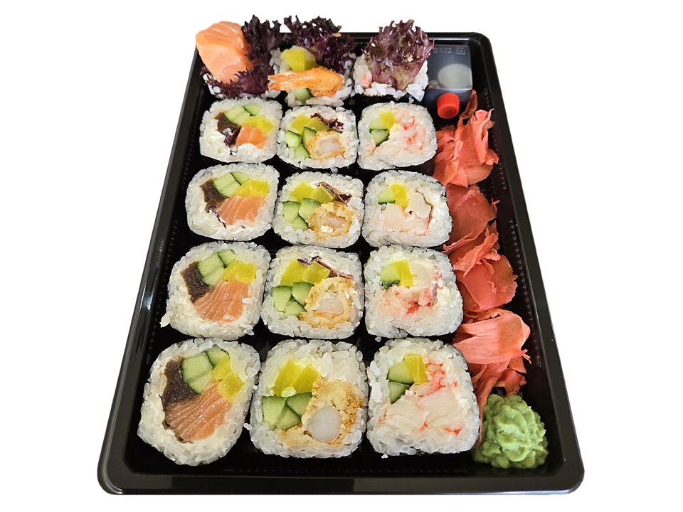 - ryż, surowy łosoś, tykwa, rzepa, ogórek, sałata, serek, nori,