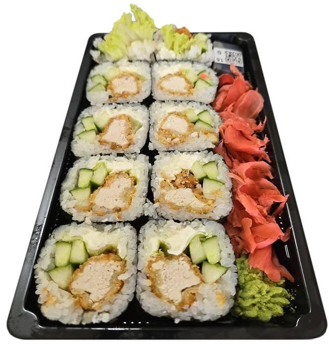 -ryż, kurczak w tempurze i panko, ogórek, sałata, serek, nori